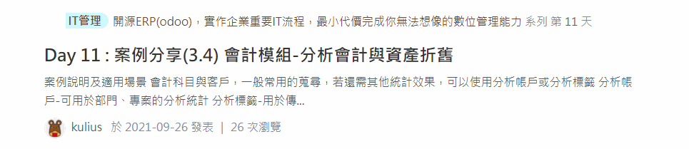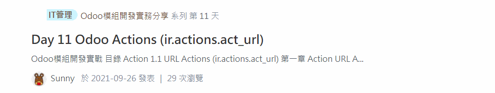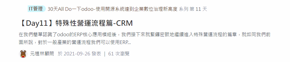 首先,這次三人組隊,個別依據下列三大主題進行後續30天鐵人賽發文,而我們follow這30天的30篇文章,簡單做個紀錄追蹤與文章連結分享,讓後續進入協會網站的各位可以快速輕鬆地查看相關odoo文章。