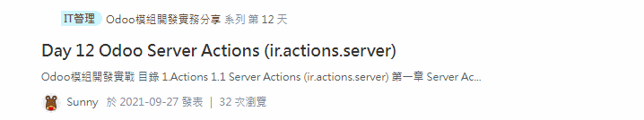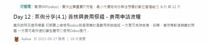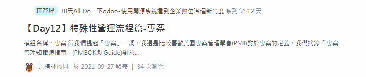 首先,這次三人組隊,個別依據下列三大主題進行後續30天鐵人賽發文,而我們follow這30天的30篇文章,簡單做個紀錄追蹤與文章連結分享,讓後續進入協會網站的各位可以快速輕鬆地查看相關odoo文章。