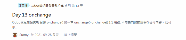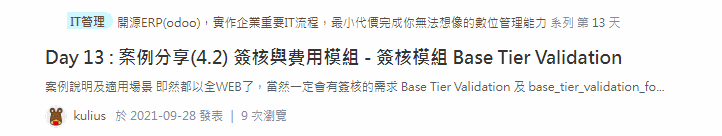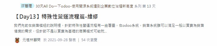 首先,這次三人組隊,個別依據下列三大主題進行後續30天鐵人賽發文,而我們follow這30天的30篇文章,簡單做個紀錄追蹤與文章連結分享,讓後續進入協會網站的各位可以快速輕鬆地查看相關odoo文章。