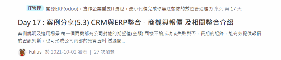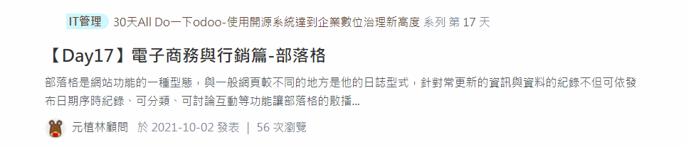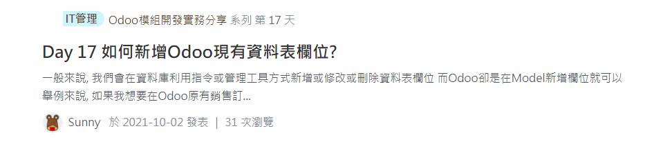 首先,這次三人組隊,個別依據下列三大主題進行後續30天鐵人賽發文,而我們follow這30天的30篇文章,簡單做個紀錄追蹤與文章連結分享,讓後續進入協會網站的各位可以快速輕鬆地查看相關odoo文章。