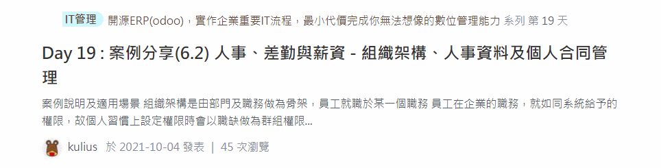 首先,這次三人組隊,個別依據下列三大主題進行後續30天鐵人賽發文,而我們follow這30天的30篇文章,簡單做個紀錄追蹤與文章連結分享,讓後續進入協會網站的各位可以快速輕鬆地查看相關odoo文章。
