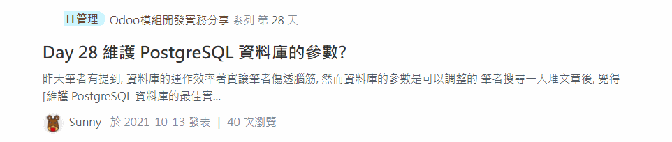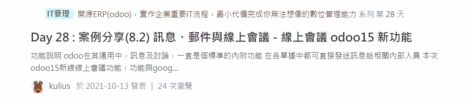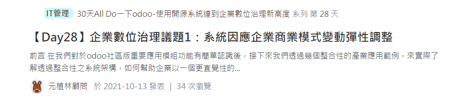 首先,這次三人組隊,個別依據下列三大主題進行後續30天鐵人賽發文,而我們follow這30天的30篇文章,簡單做個紀錄追蹤與文章連結分享,讓後續進入協會網站的各位可以快速輕鬆地查看相關odoo文章。