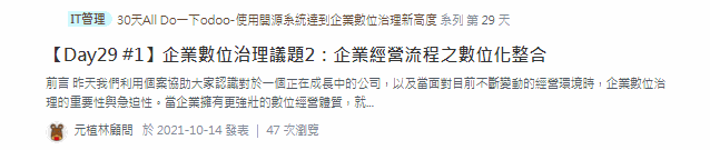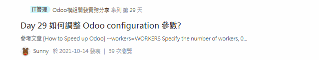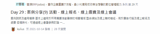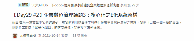 首先,這次三人組隊,個別依據下列三大主題進行後續30天鐵人賽發文,而我們follow這30天的30篇文章,簡單做個紀錄追蹤與文章連結分享,讓後續進入協會網站的各位可以快速輕鬆地查看相關odoo文章。