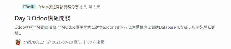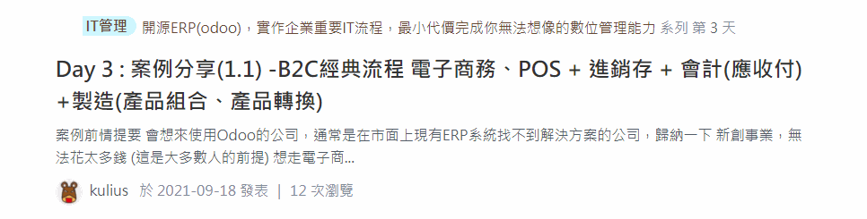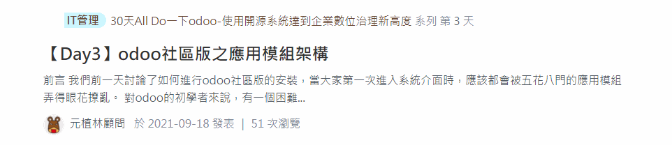 首先,這次三人組隊,個別依據下列三大主題進行後續30天鐵人賽發文,而我們follow這30天的30篇文章,簡單做個紀錄追蹤與文章連結分享,讓後續進入協會網站的各位可以快速輕鬆地查看相關odoo文章。
