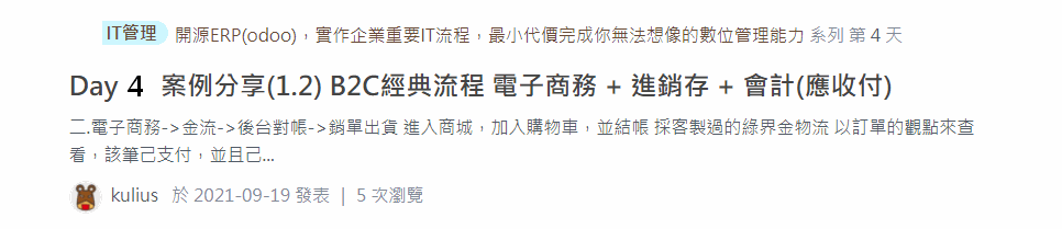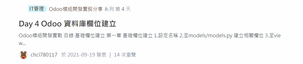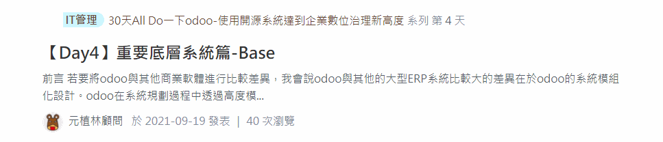 首先,這次三人組隊,個別依據下列三大主題進行後續30天鐵人賽發文,而我們follow這30天的30篇文章,簡單做個紀錄追蹤與文章連結分享,讓後續進入協會網站的各位可以快速輕鬆地查看相關odoo文章。