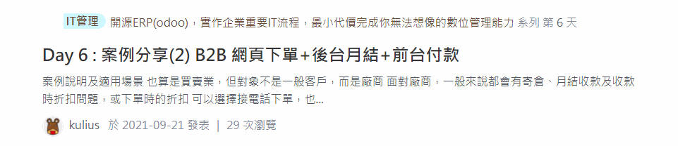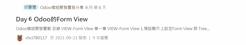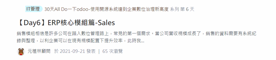 首先,這次三人組隊,個別依據下列三大主題進行後續30天鐵人賽發文,而我們follow這30天的30篇文章,簡單做個紀錄追蹤與文章連結分享,讓後續進入協會網站的各位可以快速輕鬆地查看相關odoo文章。