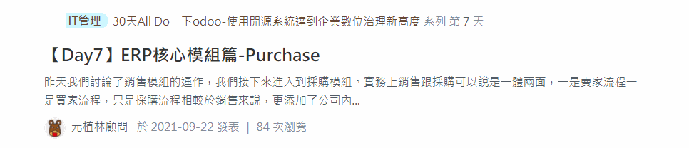 首先,這次三人組隊,個別依據下列三大主題進行後續30天鐵人賽發文,而我們follow這30天的30篇文章,簡單做個紀錄追蹤與文章連結分享,讓後續進入協會網站的各位可以快速輕鬆地查看相關odoo文章。