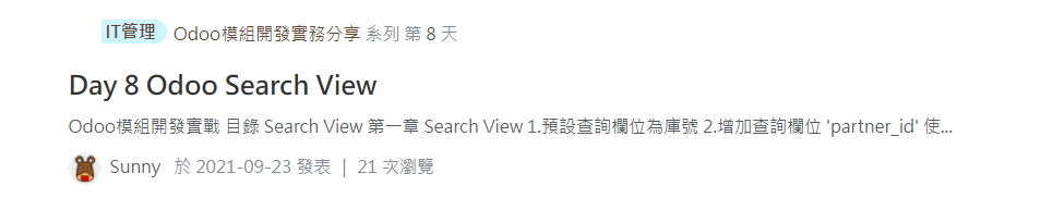 首先,這次三人組隊,個別依據下列三大主題進行後續30天鐵人賽發文,而我們follow這30天的30篇文章,簡單做個紀錄追蹤與文章連結分享,讓後續進入協會網站的各位可以快速輕鬆地查看相關odoo文章。