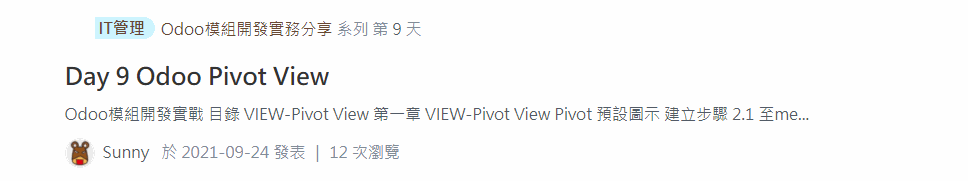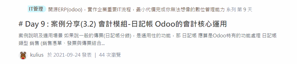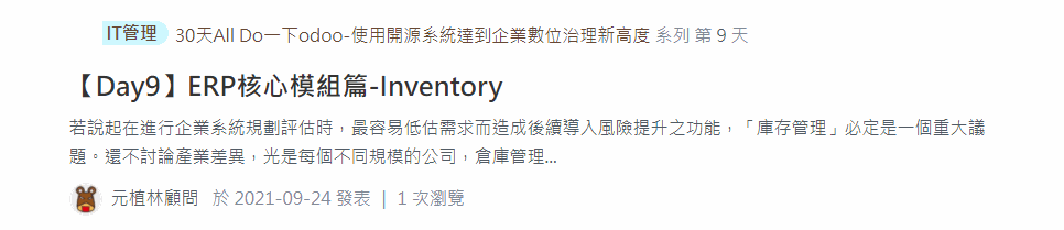 首先,這次三人組隊,個別依據下列三大主題進行後續30天鐵人賽發文,而我們follow這30天的30篇文章,簡單做個紀錄追蹤與文章連結分享,讓後續進入協會網站的各位可以快速輕鬆地查看相關odoo文章。